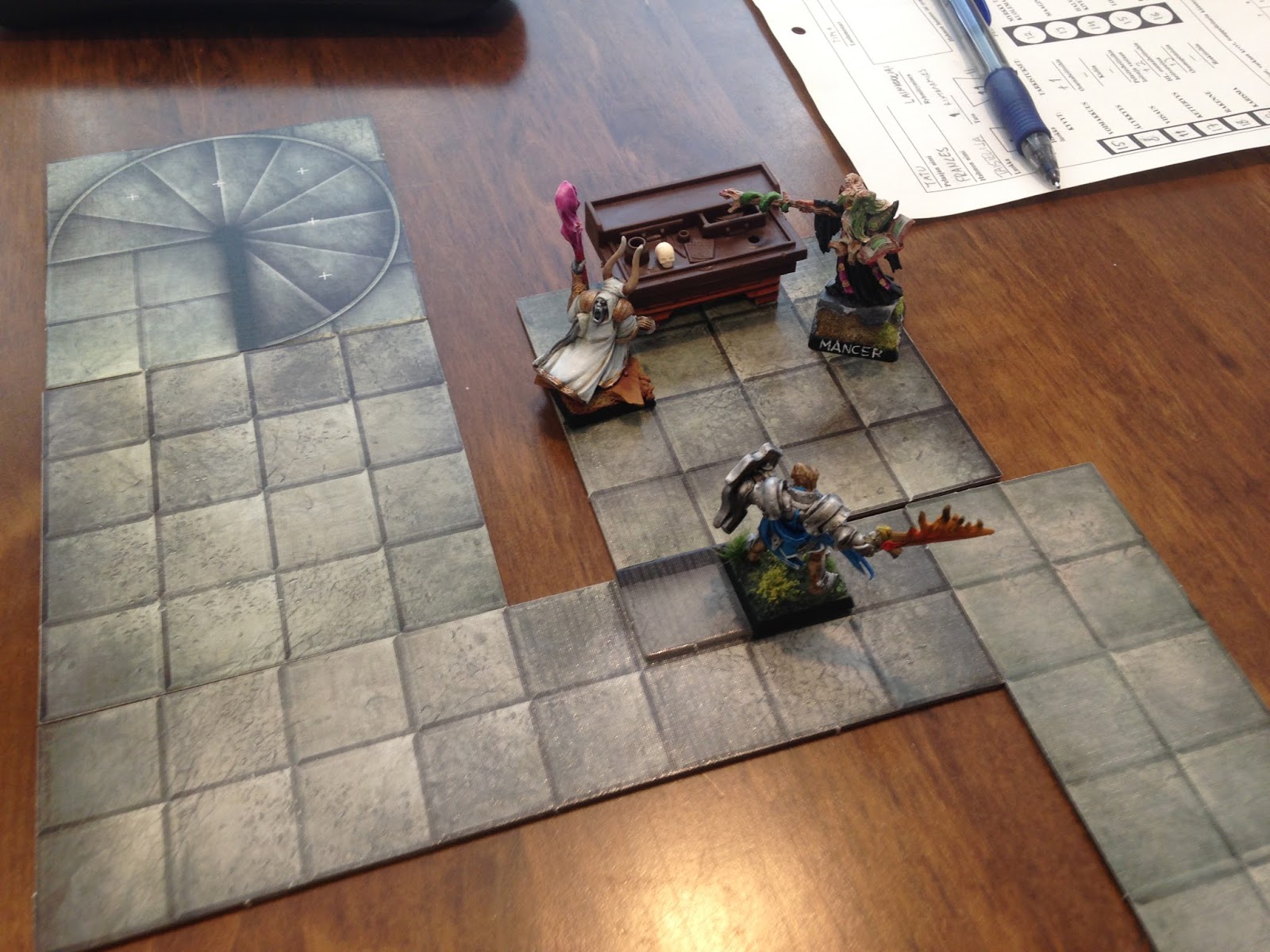 Naturally I had to come up with a game being "mr. War Hammer" as he keeps calling me. So after everyone else went to bed, I collected my dice, miniatures, Dungeon tiles and Otherworld Fantasy Skirmish and off we went.
